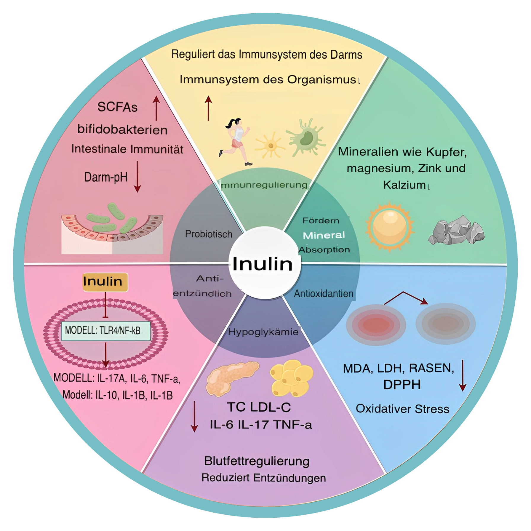 Als Präbiotikum unterstützt Inulin das Wachstum dieser nützlichen Mikroorganismen, wodurch das Darmmikrobiom gestärkt wird. Ein gesundes Mikrobiom trägt nicht nur zur Verdauung und Nährstoffaufnahme bei, sondern hat auch positiven Einfluss auf das Immunsystem und sogar auf das mentale Wohlbefinden durch die Verbindung zwischen Darm und Gehirn (Darm-Hirn-Achse). Studien zeigen zudem, dass Inulin eine stabilisierende Wirkung auf den Blutzuckerspiegel haben kann, indem es die Resorption von Glukose verlangsamt und so Blutzuckerspitzen nach den Mahlzeiten reduziert. Gleichzeitig kann es zur Sättigung beitragen, was es zu einem hilfreichen Bestandteil einer ausgewogenen Ernährung macht.